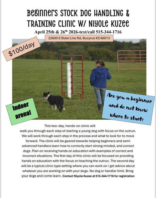 This two-day, hands-on clinic will walk you through each step of starting a young dog with focus on the outrun. We will work through each step in the process and what to look for to move forward. The clinic will be geared towards helping beginners and semi advanced handlers learn how to correctly start strong minded, and correct dogs. Plan on receiving hands on education with examples of correct and incorrect situations. The first day of this clinic will be focused on providing hands on education with the focus on teaching the outrun. The second day will be a typical clinic type setting where you can work on / get advice about whatever you are working on with your dogs. No dog or handler limit. Bring your dogs and come learn. Indoor arena.
