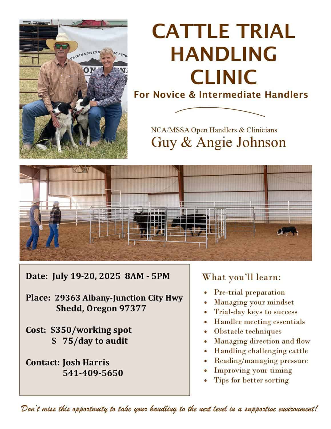 Are you a novice or intermediate cattle trial competitor eager to improve your skills and learn from experienced coaches? Join us for a two-day hands-on clinic designed specifically for MSSA/NCA style cattle trialing. Don’t miss this opportunity to learn from seasoned open handlers in a supportive environment!