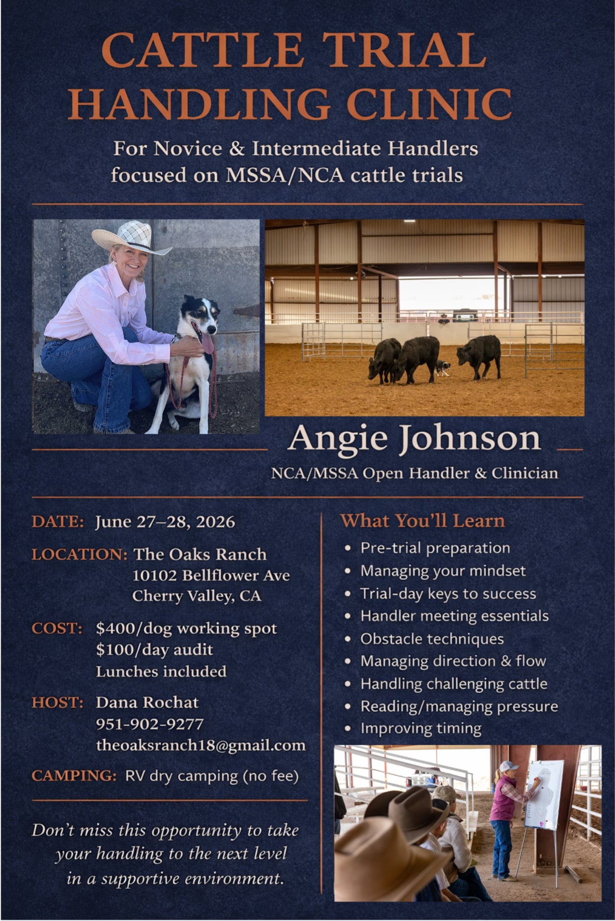 This is an intensive working seminar for novice and intermediate cattle trial competitors who want to improve. It is also suitable for people with dogs that are trained and already working cattle on command who are interested in competing in cattle trials. Participants will have a chance to work multiple full courses each day with their dog as well as learn through several white-board sessions and Q&A. Limited to 10 working spots.