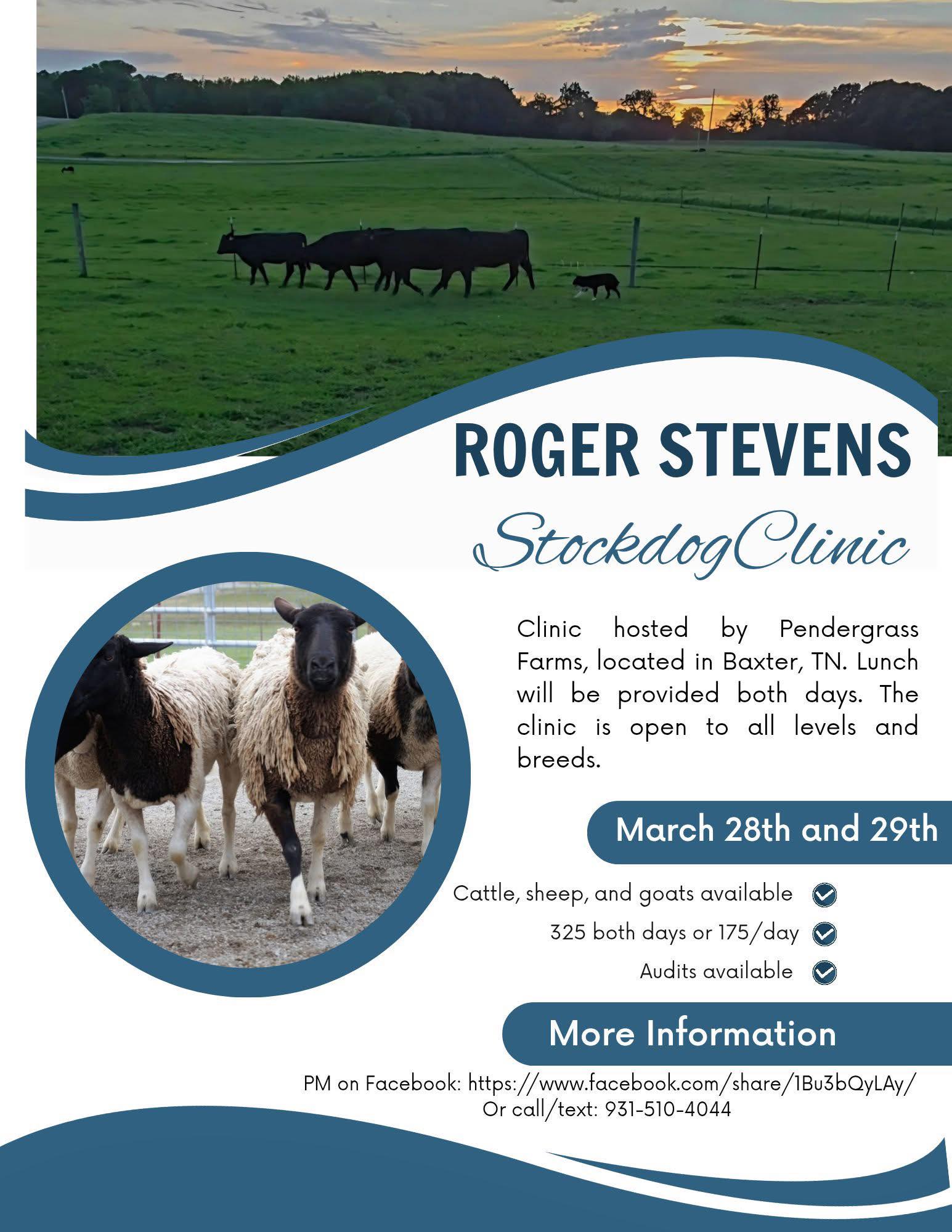 Clinic hosted by Pendergrass Farms, located in Baxter, TN. Lunch will be provided both days. The clinic is open to all levels and breeds. Cattle, sheep, and goats. Auditing available.