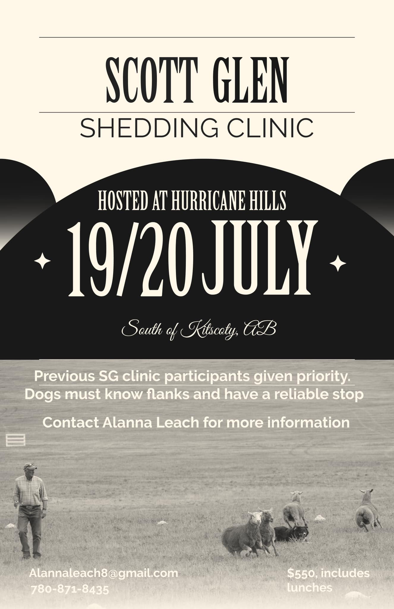 Lessons limited to one spot per person. Open to new or previous students. Previous Scott Glen participants given priority. Dogs must know flanks and have a reliable stop to participate in the shedding clinic.