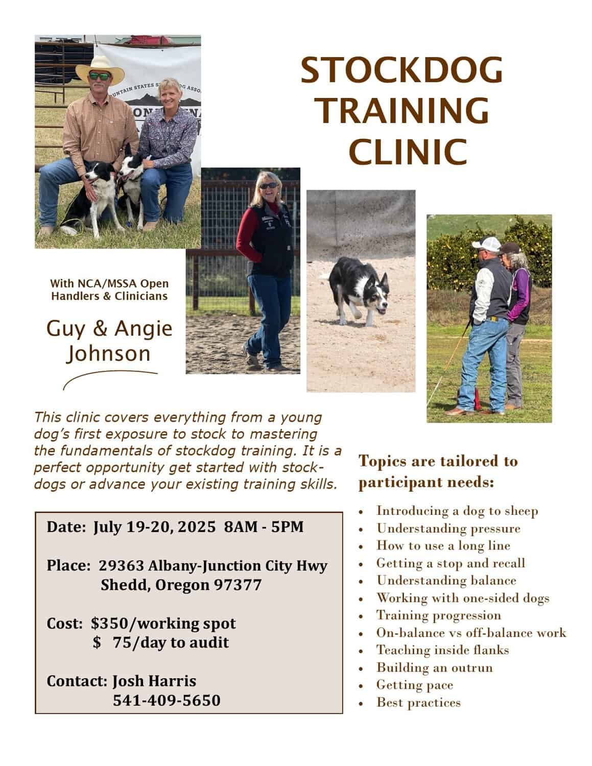 Guy & Angie Johnson of Double J Border Collies are open-level handlers and trainers who compete actively in NCA, MSSA, and USBCHA trials. They have been breeding top quality working border collies for the past 17 years and providing stockdog clinics for their puppy owners for the past 6 years. What sets them apart as clinicians is their approachability and communication skills. Both come from careers in education and thus have an ability to work effectively with a wide variety of people.