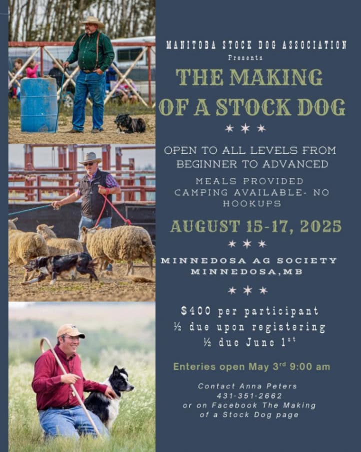 • meals ( supper Friday, breakfast, lunch,supper Saturday, breakfast, lunch Sunday) included in price • 3 clinicians taking different levels of dogs and handlers (beginner, intermediate, advanced) • clinicians are Jared Epp, Campbell Forsyth George Clark • free camping (no hookups) • trial Friday with champion buckle (must be a clinic participants) • informational speakers TBA • Auditors welcome! • entries for the clinic will begin at 9am May 3, 2025 via The Making of A Stockdog’s FB messenger or Anna Peters 431-351-2662