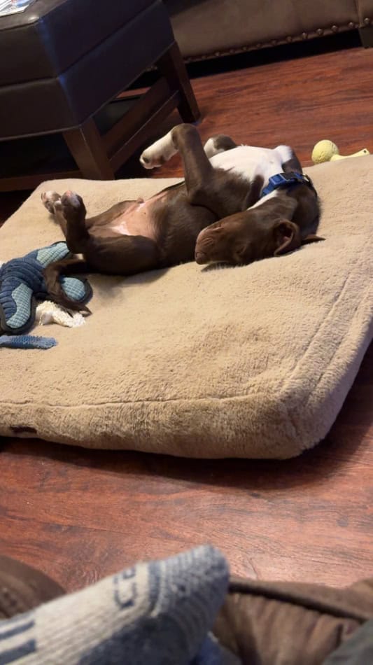 Dos is indestructible in the toughest of country, and extremely loyal. He has a lot of distance, will climb anything, and will work nicely alone but takes really well to direction from his handler.