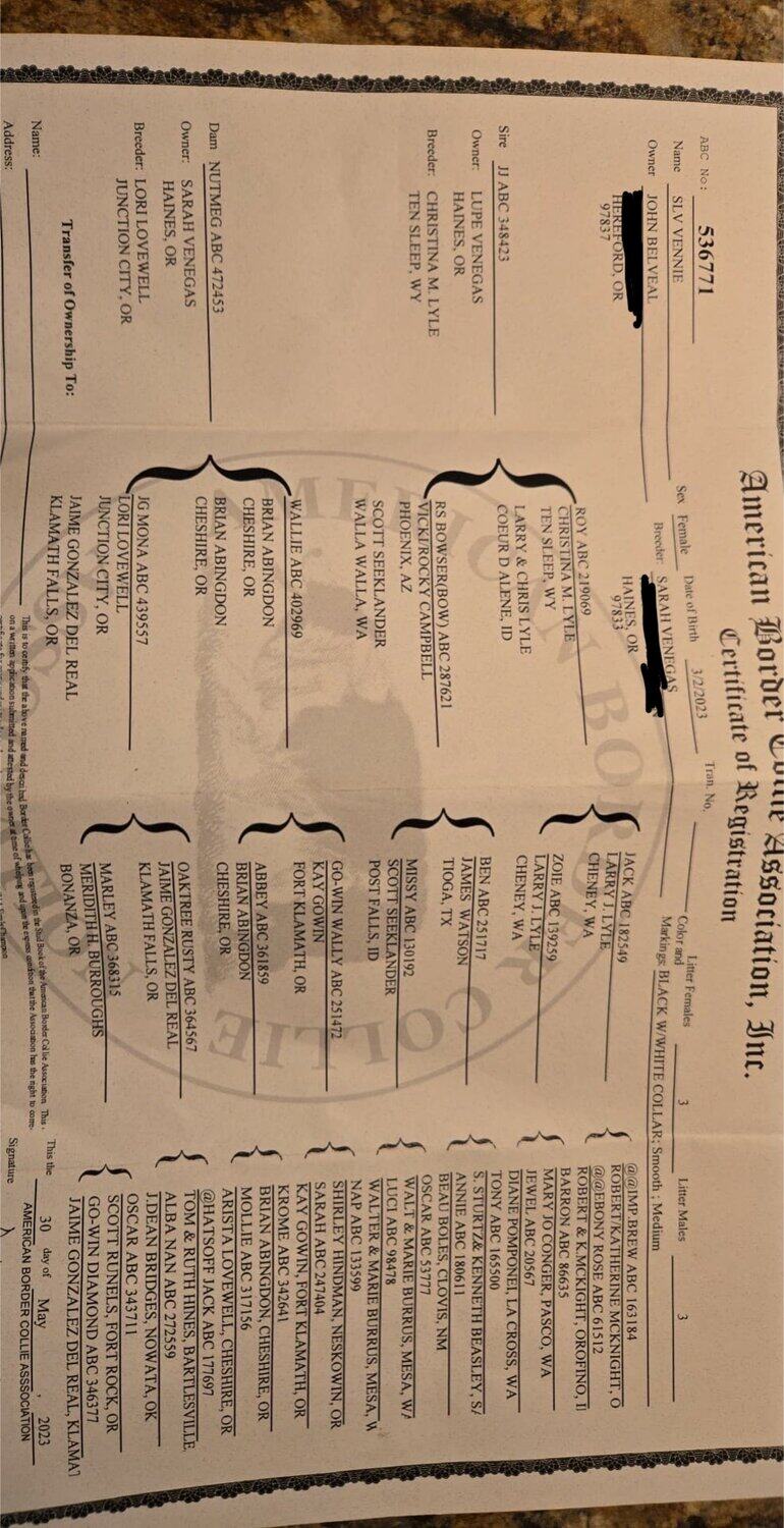 SLV Vennie 2yr old ABCA female. This versatile young dog does well in both the arena and going to work. She spent a year with a professional trainer being shown on both sheep and cattle in the nursery and intermediate classes. She qualified in all classes and competed in the futurity for both species at MSSA finals in June 2025. She is a user friendly dog, very biddable and wont cause a wreck. She has a good gather, stop and knows her directions.